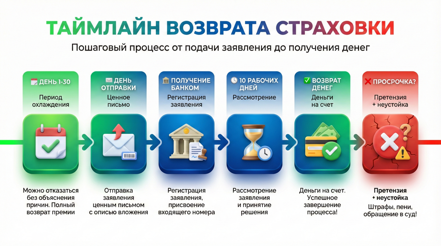 - При своевременном отказе страховая компания обязана вернуть 100% страховой премии в течение 10 рабочих дней