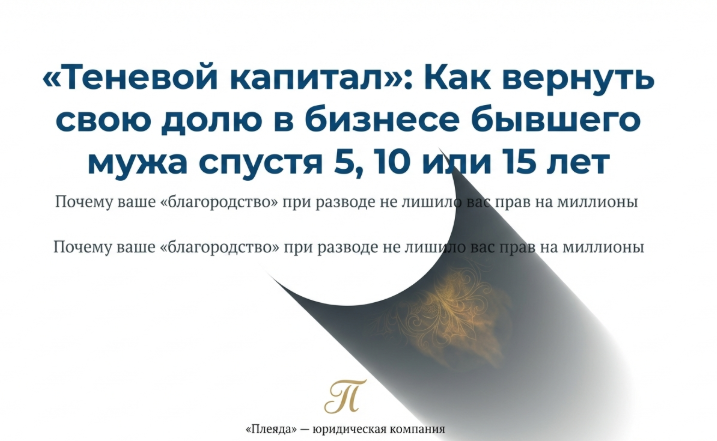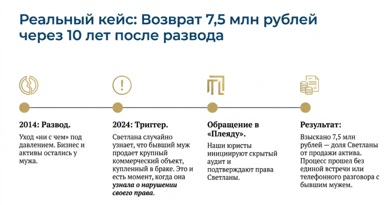 Триггер: Когда «бывший» решает, что он — единственный хозяин Прошло 6 лет. Анна узнала, что Сергей расширяет производство и продает старый цех и часть оборудования за несколько десятков миллионов рублей, чтобы купить землю под новый завод. Она чувствовала жгучую несправедливость: «Мы же вместе это начинали! Почему я сейчас экономлю на отпуске детей, а он распоряжается плодами нашего общего труда? Но ведь 3 года уже прошли...».