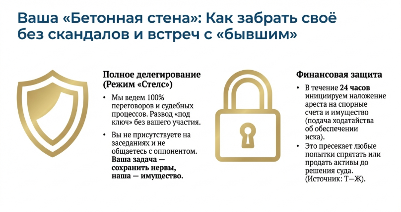 Решение: «Бетонная стена» защиты Анна не хотела скандалов и встреч с Сергеем. Юристы «Плеяды» взяли всё на себя (режим «под ключ»):